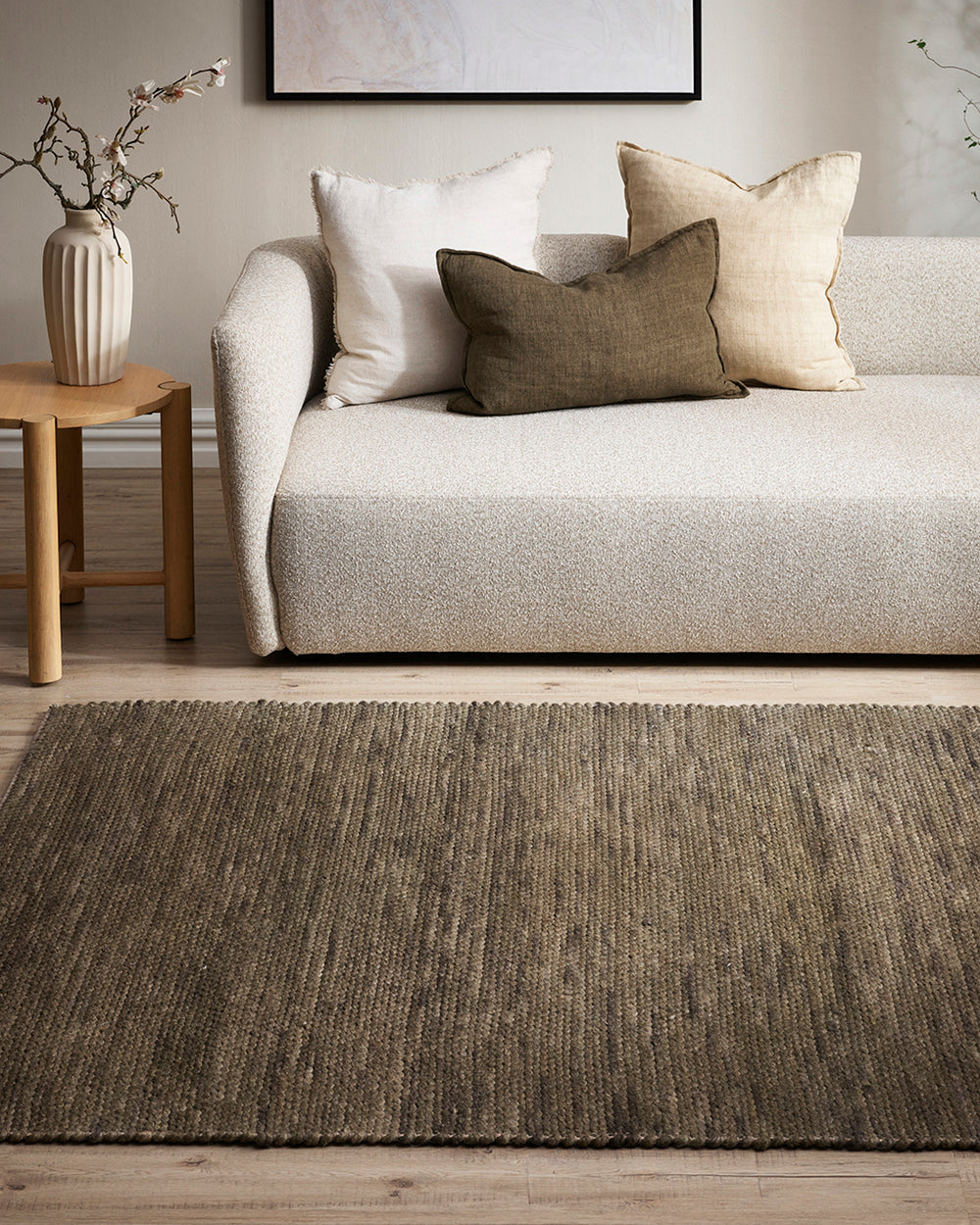 Immerse yourself in the moody green tones of our Boardwalk floor rug. Space-dyed wool and cotton fibres form a mottled pattern reminiscent of forest foliage. Rustic with a refined feel, the Boardwalk invites us to create nurturing spaces that promote well-being.