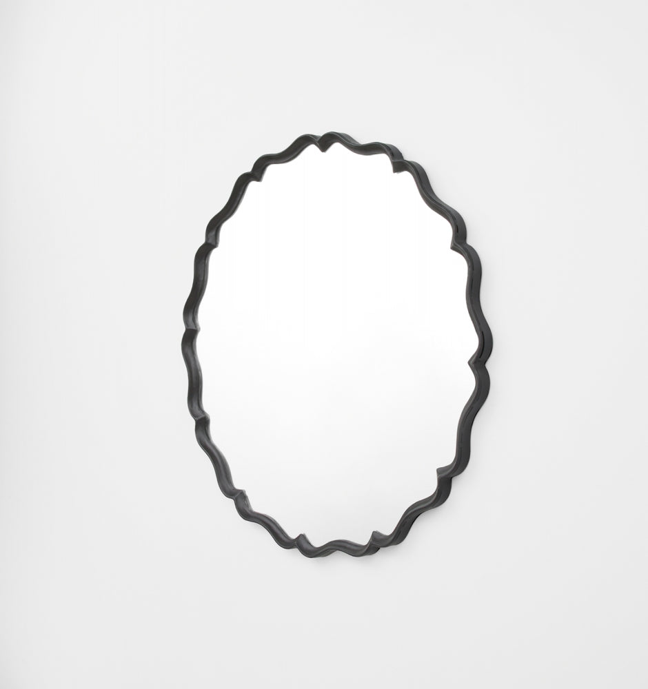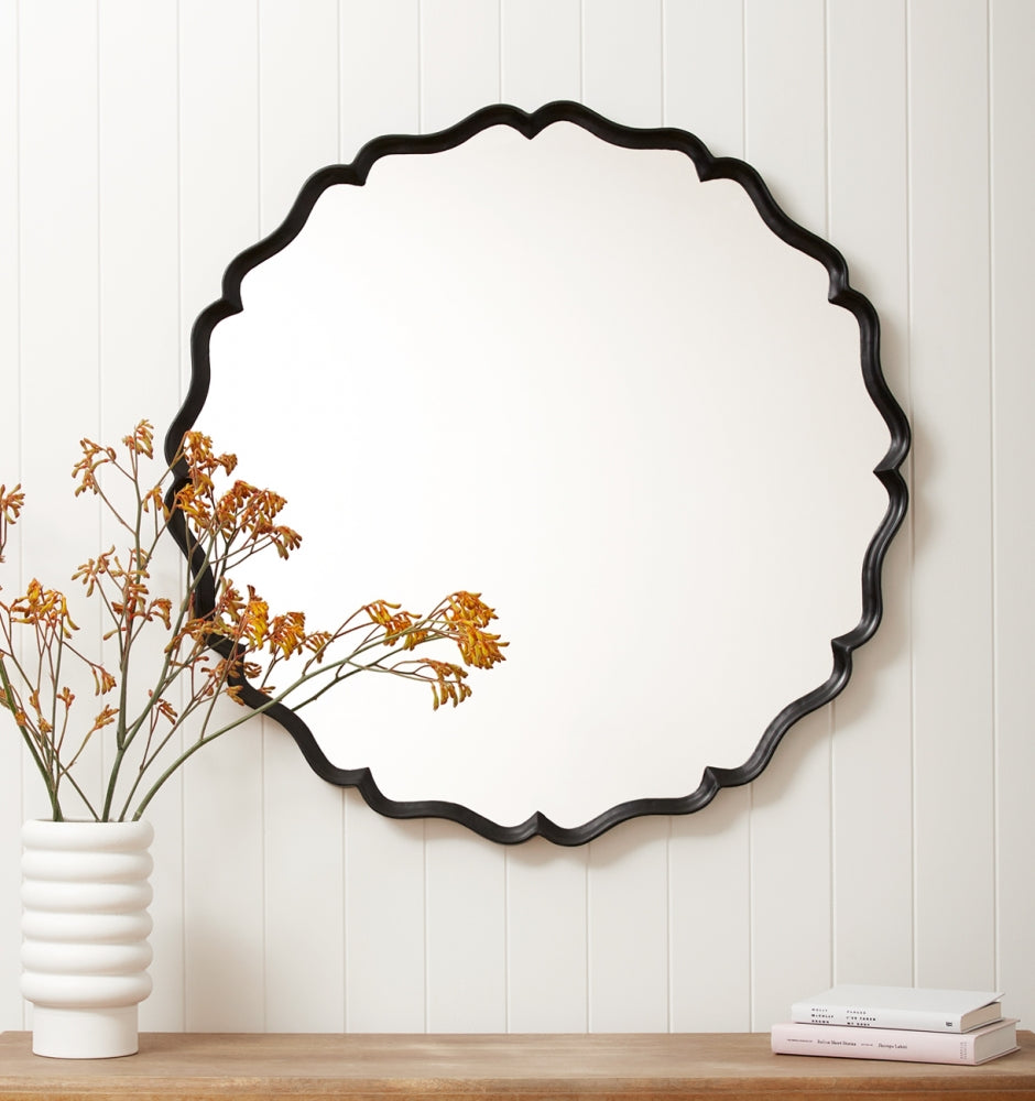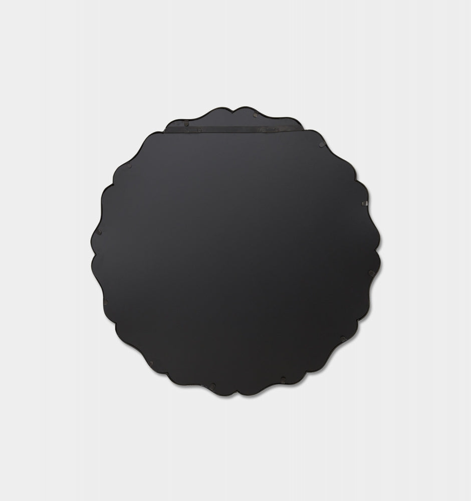 The Abella Black Mirror features an irregular scalloped profile with softly undulating curves, giving the piece a decorative, organic outline rather than a circular form. The matte black metal frame provides a defined edge that contrasts cleanly against the mirrored glass, making it a considered statement piece without excessive visual weight. Suitable for entryways, living spaces, or bedrooms where a sculptural wall mirror is desired.